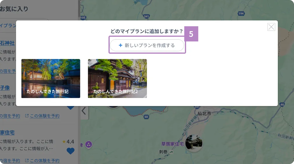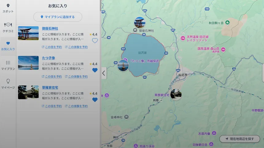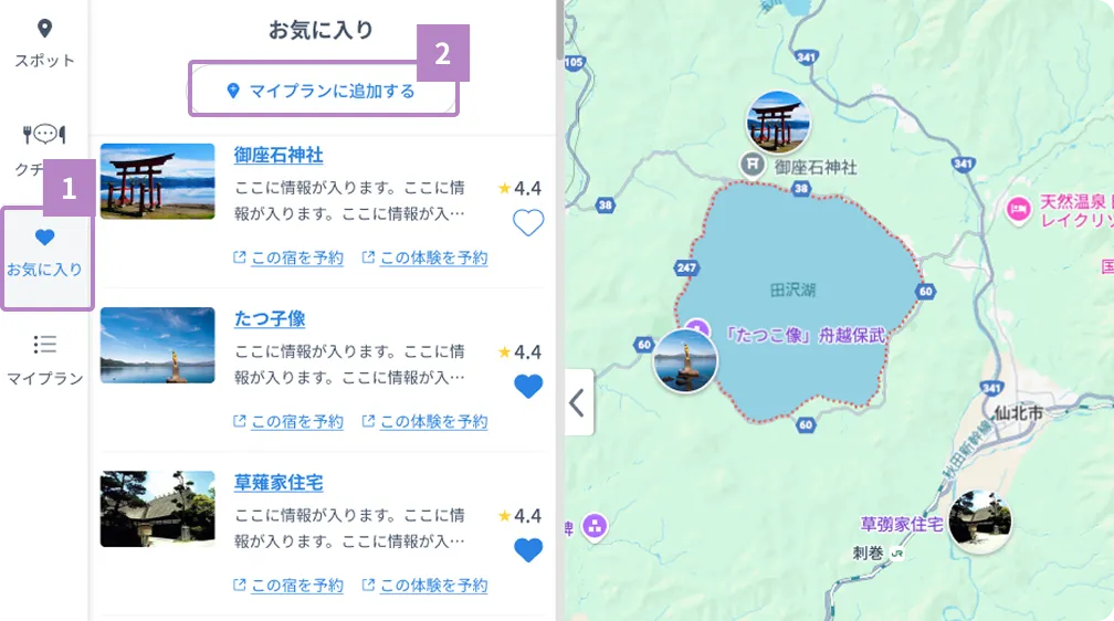 Using the tourist map function, you can create your own plan from your favorite spots on the site and sample courses that interest you.