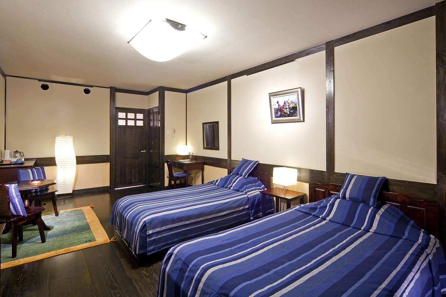 A relaxing and comfortable hotel with pale pink weeping cherry blossoms swaying against black wooden walls