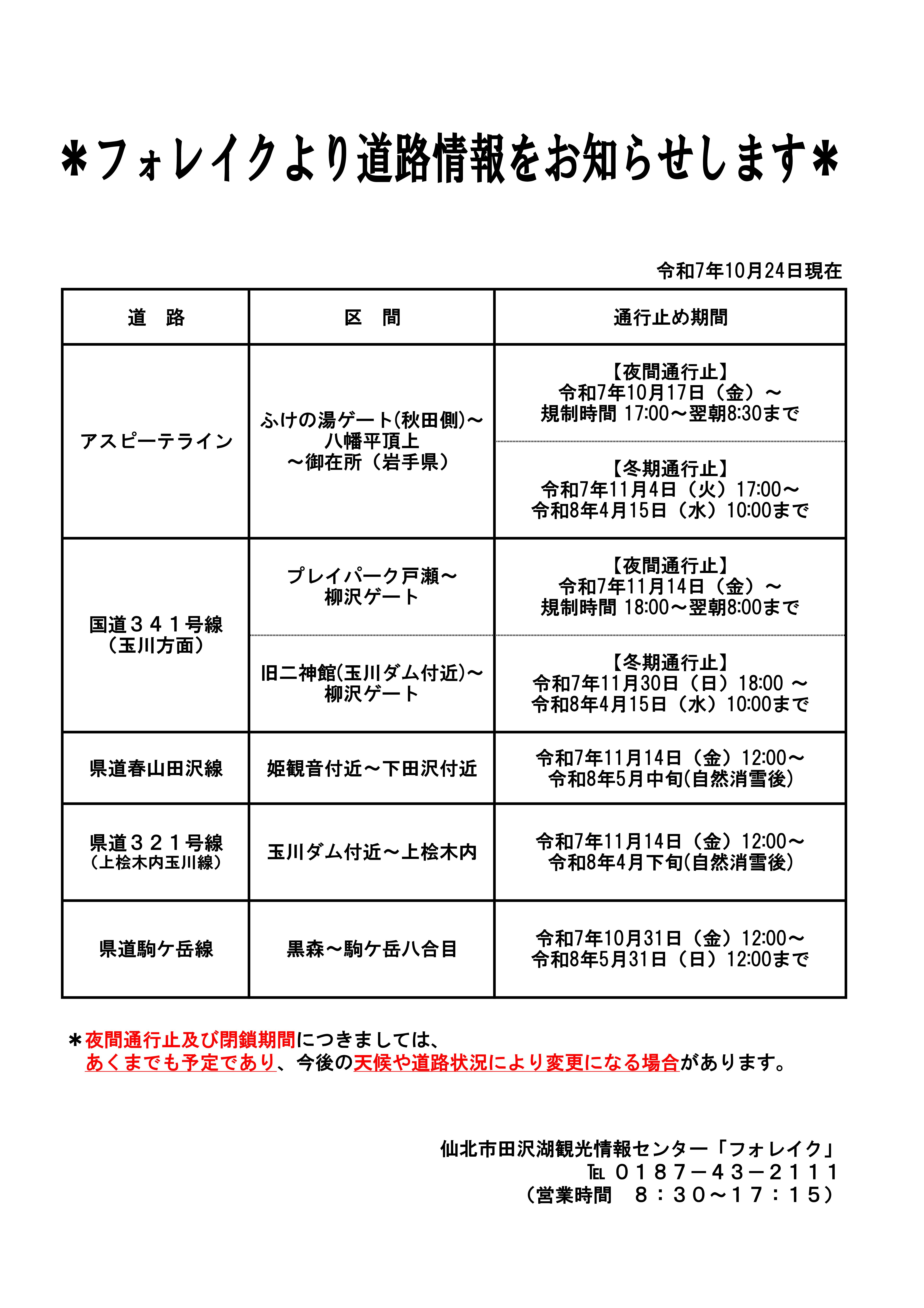 田沢湖エリア最新道路情報※2025年10月24日(金)現在